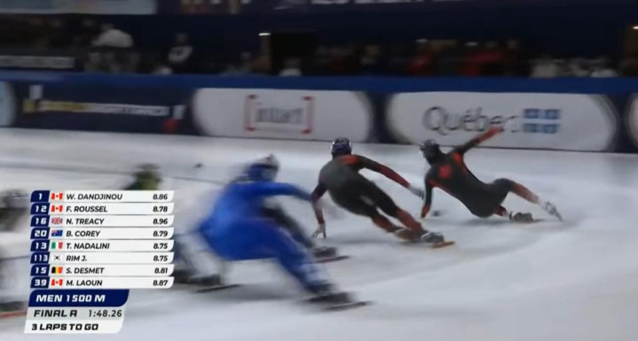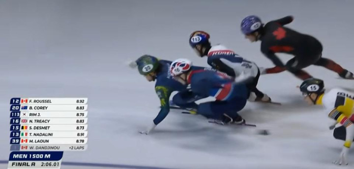 A组决赛场面激烈。澳大利亚选手科里和英国选手特雷西开场交替领先。倒数第四圈,加拿大的丹吉努发力超到第一位,接着鲁赛尔也超到第二位。